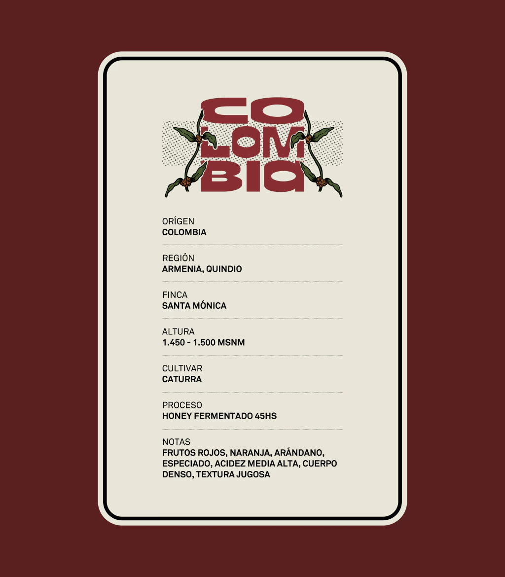 Este café colombiano variedad Caturra, llega desde las montañas de Armenia, Quindío. Su proceso natural con fermentación de 45 horas realza un perfil jugoso e intenso, con notas a frutos rojos, naranja, arándano y un toque especiado. Es un café vibrante, de textura envolvente y con una acidez que le da mucha vida en boca.